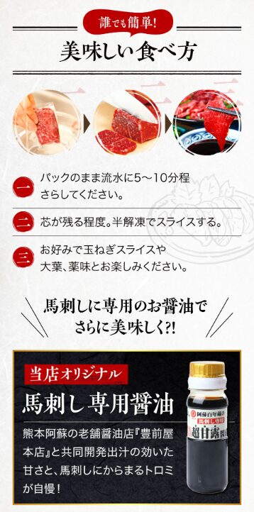 「独自の加工から急速冷凍により 、新鮮で極上の馬刺しをお届け」